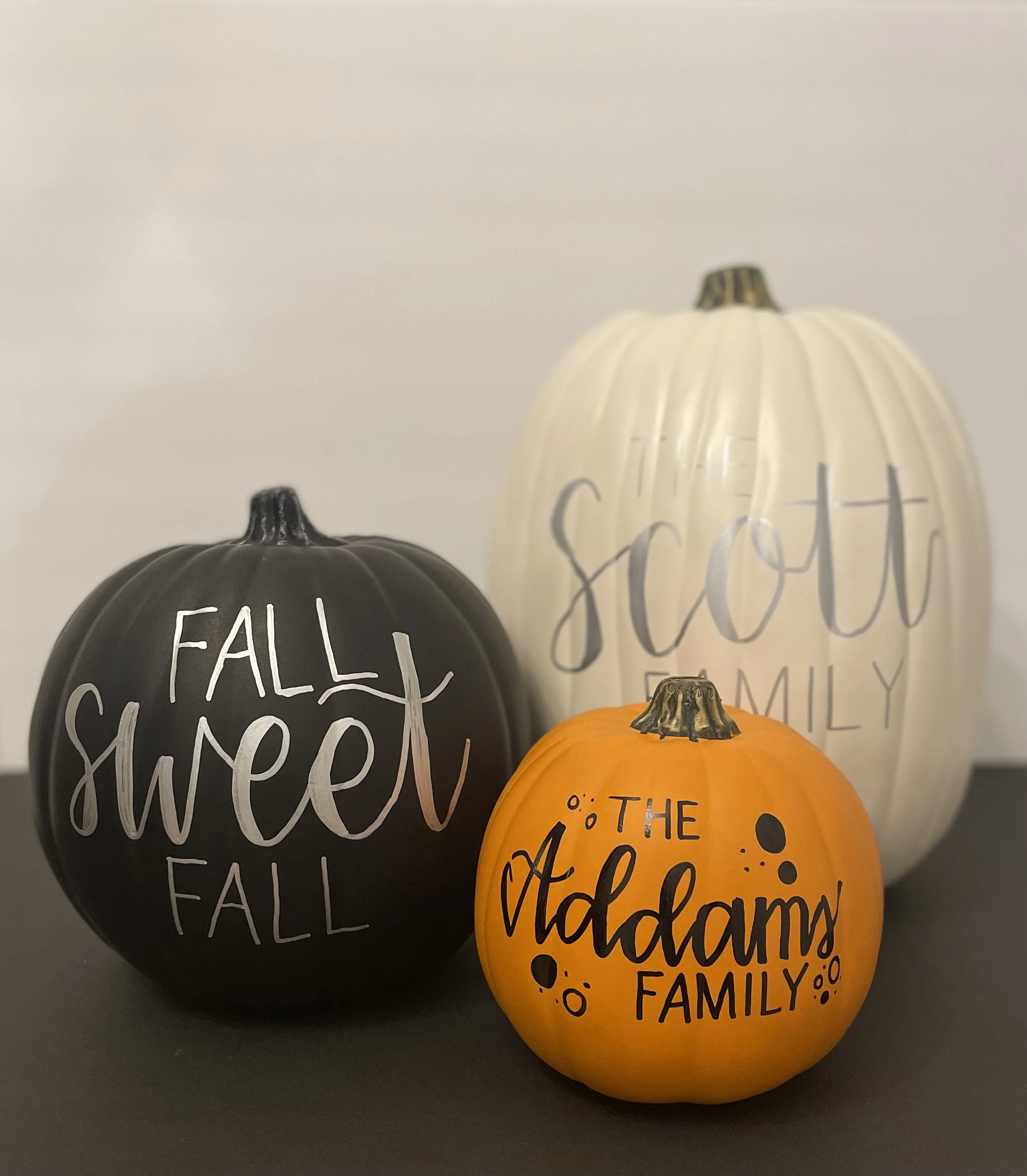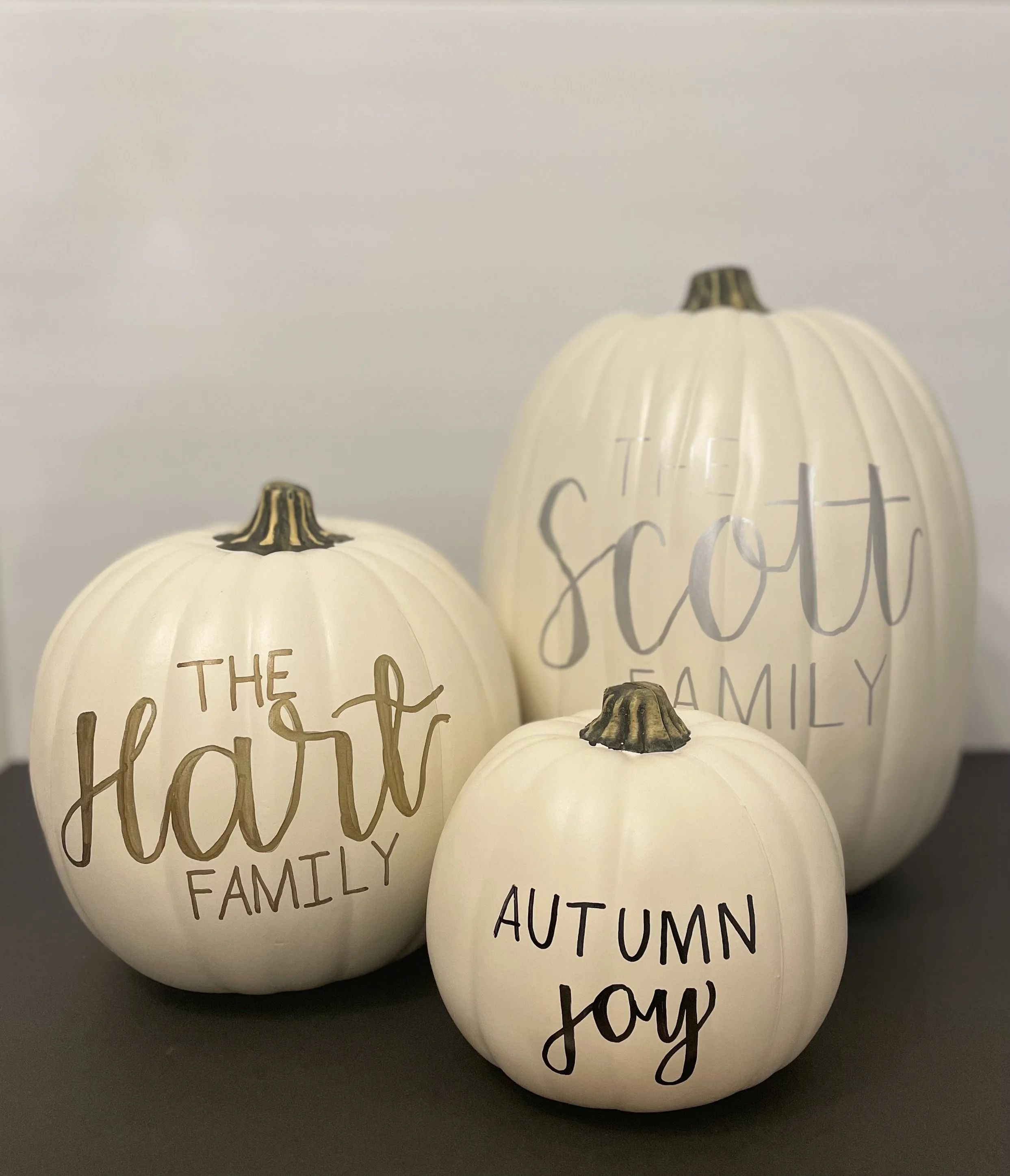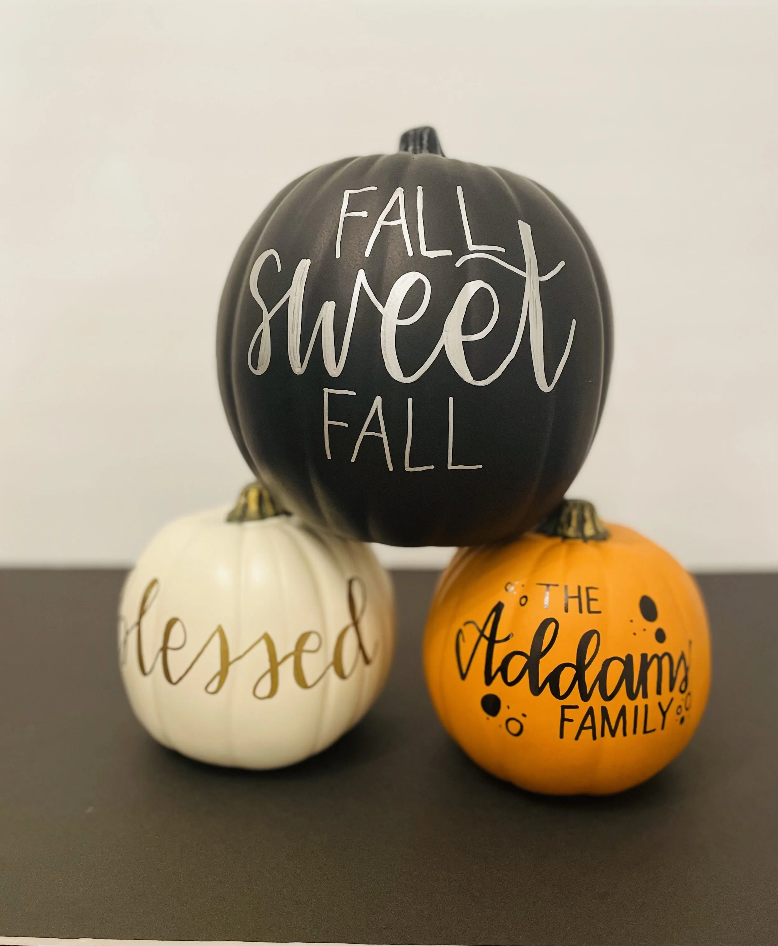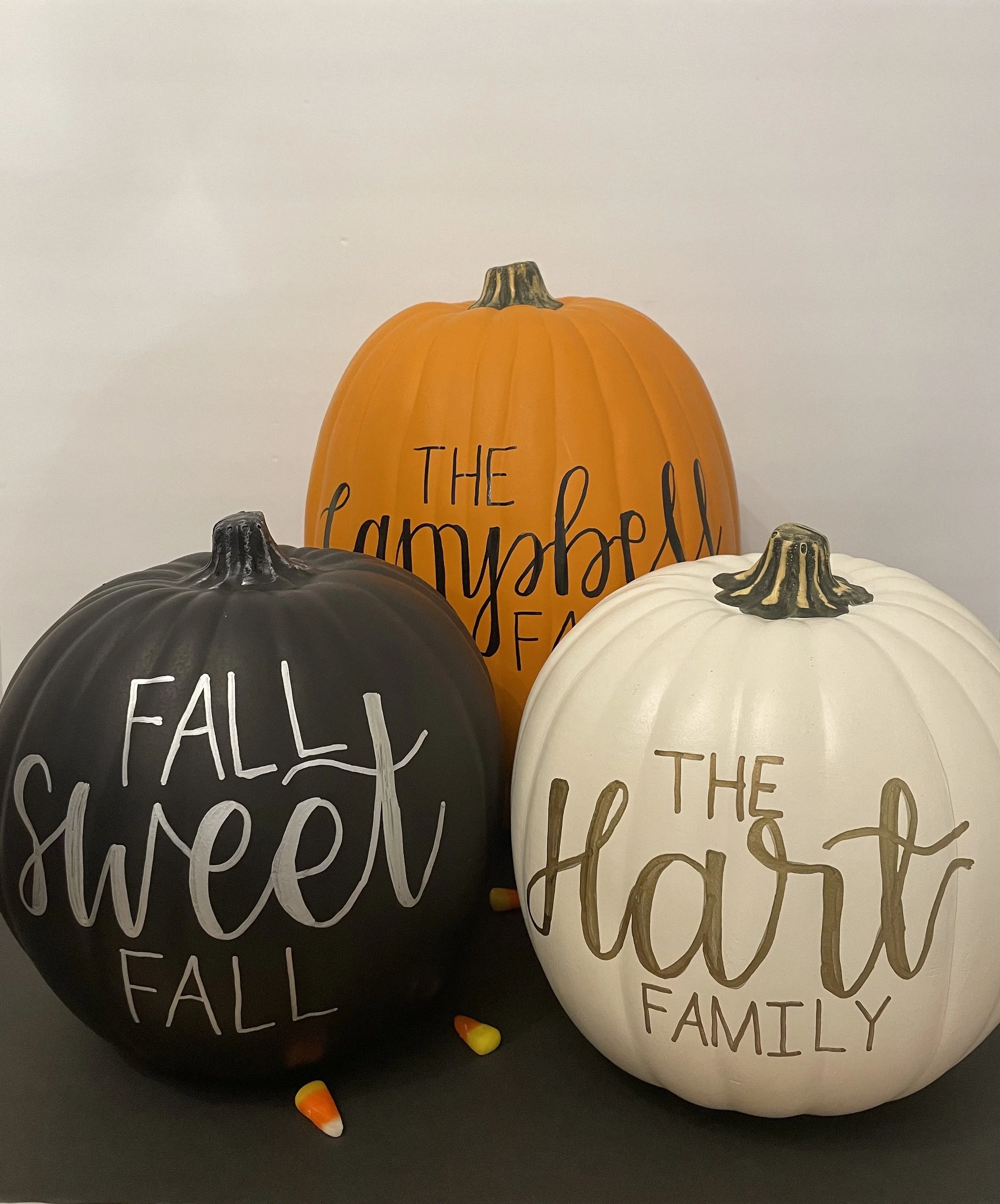 Categories: Select a Category Mini Pumpkins Small Pumpkins Medium Pumpkins Large Pumpkins Hand-lettered pumpkins that turn any porch or table into a fall centerpiece. Mini Pumpkins Small Pumpkins Medium Pumpkins Large Pumpkins Quick View Small Black Pumpkin - 6.5" $25.00 Gold Silver White Add To Cart Added! Quick View Small Orange Pumpkin - 6.5" $25.00 Black Silver White Add To Cart Added! Quick View Small Cream Pumpkin - 6.5" $25.00 Black Gold Silver Add To Cart Added! Quick View Medium Cream Pumpkin - 9" $40.00 Black Gold Silver Add To Cart Added! Quick View Breast Cancer Awareness Pink Pumpkin $40.00 White Gold Add To Cart Added! Quick View Medium Black Pumpkin - 9" $40.00 Gold Silver White Add To Cart Added! Quick View Medium Orange Pumpkin - 9" $40.00 Black Silver White Add To Cart Added! Quick View 3 Mini Pumpkins - 1.5" $15.00 Black Gold Silver Add To Cart Added! Quick View Large Cream Pumpkin - 13" $50.00 Black Gold Silver Add To Cart Added! Quick View Large Orange Pumpkin - 13" $50.00 Black White Silver Add To Cart Added! Quick View Bundle #1: Small, Medium & Large x1 Sale Price: $100.00 Original Price: $115.00 Sale View Options Quick View Bundle #2: 1 Medium & 2 Small Sale Price: $80.00 Original Price: $90.00 Sale View Options Quick View Bundle #3: 1 Large & 2 Medium Sale Price: $115.00 Original Price: $130.00 Sale View Options