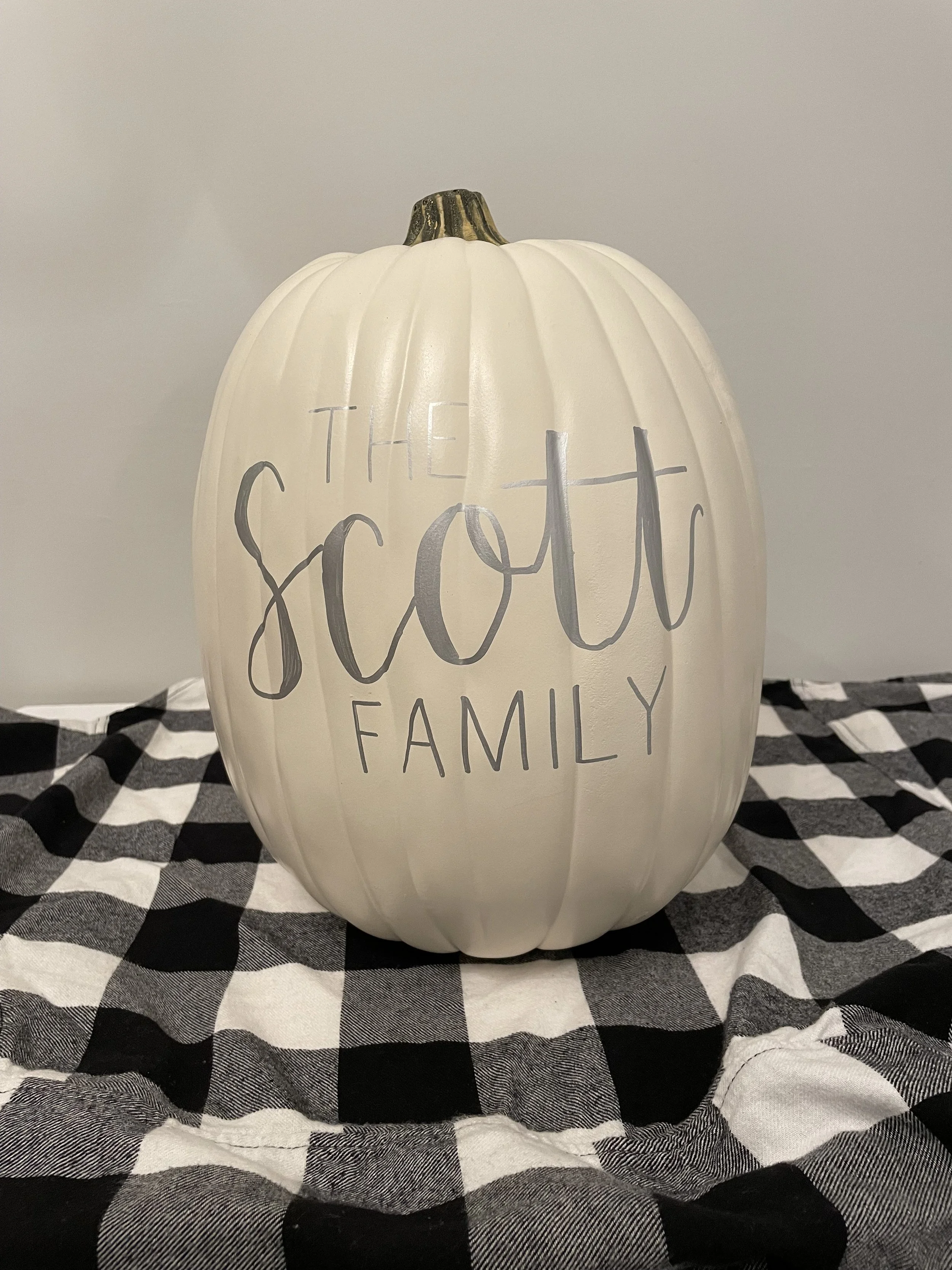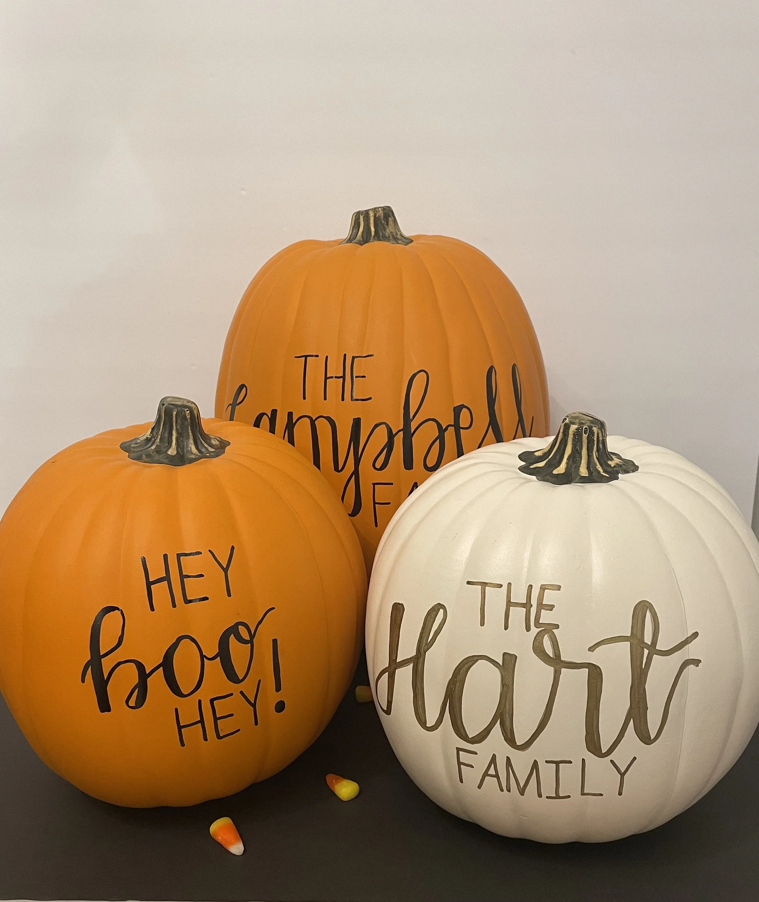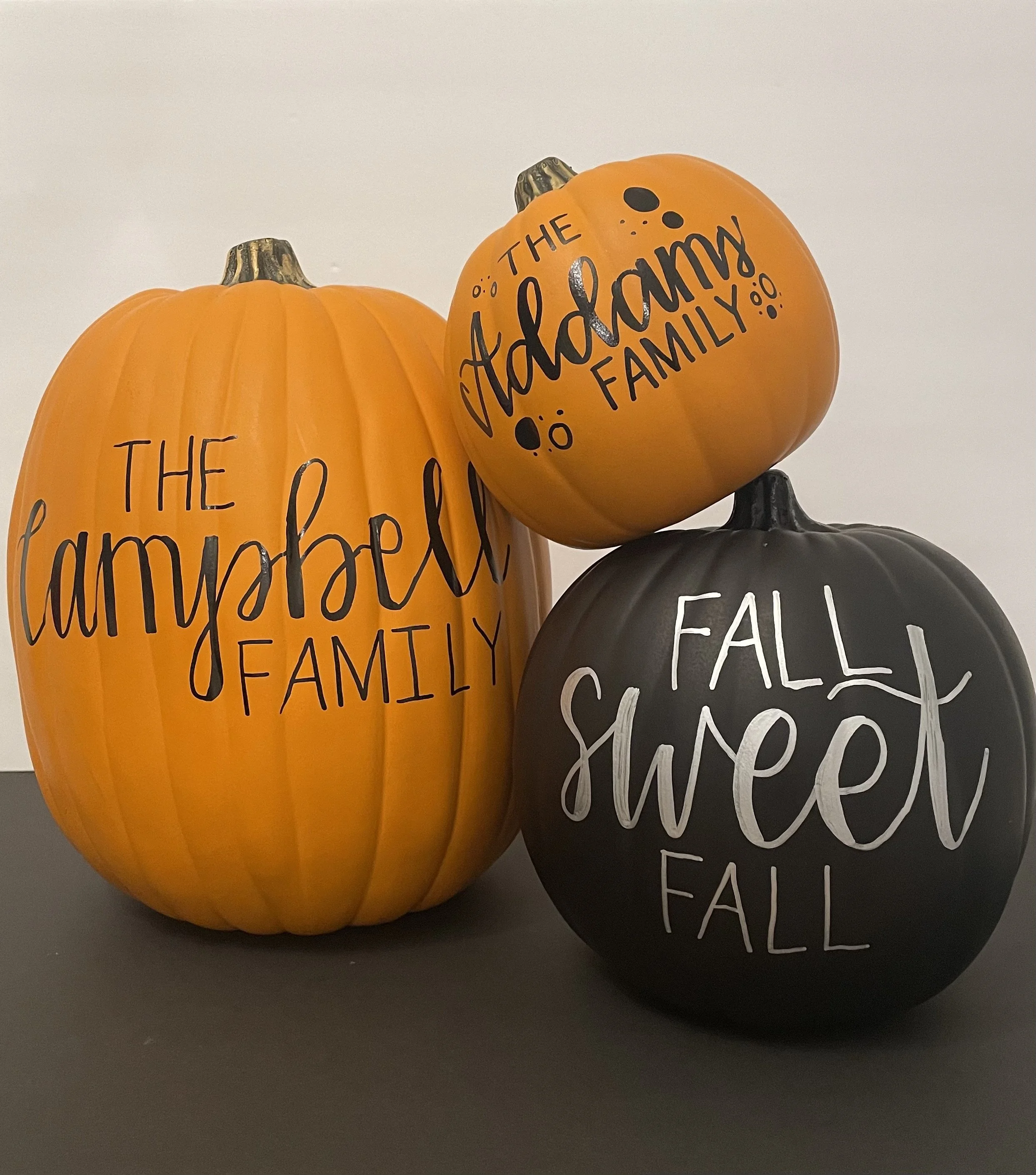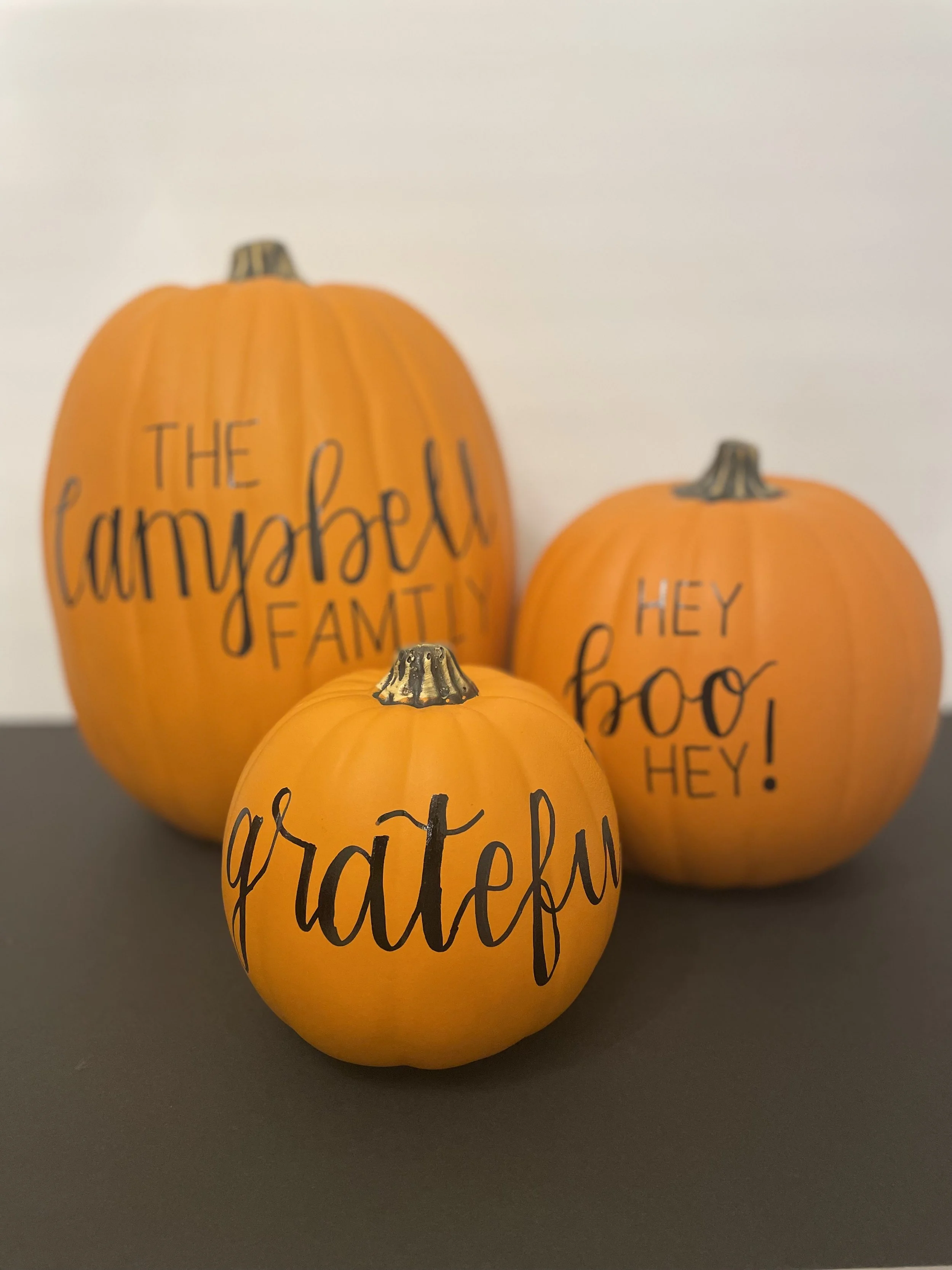 Categories: Select a Category Mini Pumpkins Small Pumpkins Medium Pumpkins Large Pumpkins Hand-lettered pumpkins that turn any porch or table into a fall centerpiece. Mini Pumpkins Small Pumpkins Medium Pumpkins Large Pumpkins Quick View Small Black Pumpkin - 6.5" $25.00 Gold Silver White Add To Cart Added! Quick View Small Orange Pumpkin - 6.5" $25.00 Black Silver White Add To Cart Added! Quick View Small Cream Pumpkin - 6.5" $25.00 Black Gold Silver Add To Cart Added! Quick View Medium Cream Pumpkin - 9" $40.00 Black Gold Silver Add To Cart Added! Quick View Breast Cancer Awareness Pink Pumpkin $40.00 White Gold Add To Cart Added! Quick View Medium Black Pumpkin - 9" $40.00 Gold Silver White Add To Cart Added! Quick View Medium Orange Pumpkin - 9" $40.00 Black Silver White Add To Cart Added! Quick View 3 Mini Pumpkins - 1.5" $15.00 Black Gold Silver Add To Cart Added! Quick View Large Cream Pumpkin - 13" $50.00 Black Gold Silver Add To Cart Added! Quick View Large Orange Pumpkin - 13" $50.00 Black White Silver Add To Cart Added! Quick View Bundle #1: Small, Medium & Large x1 Sale Price: $100.00 Original Price: $115.00 Sale View Options Quick View Bundle #2: 1 Medium & 2 Small Sale Price: $80.00 Original Price: $90.00 Sale View Options Quick View Bundle #3: 1 Large & 2 Medium Sale Price: $115.00 Original Price: $130.00 Sale View Options